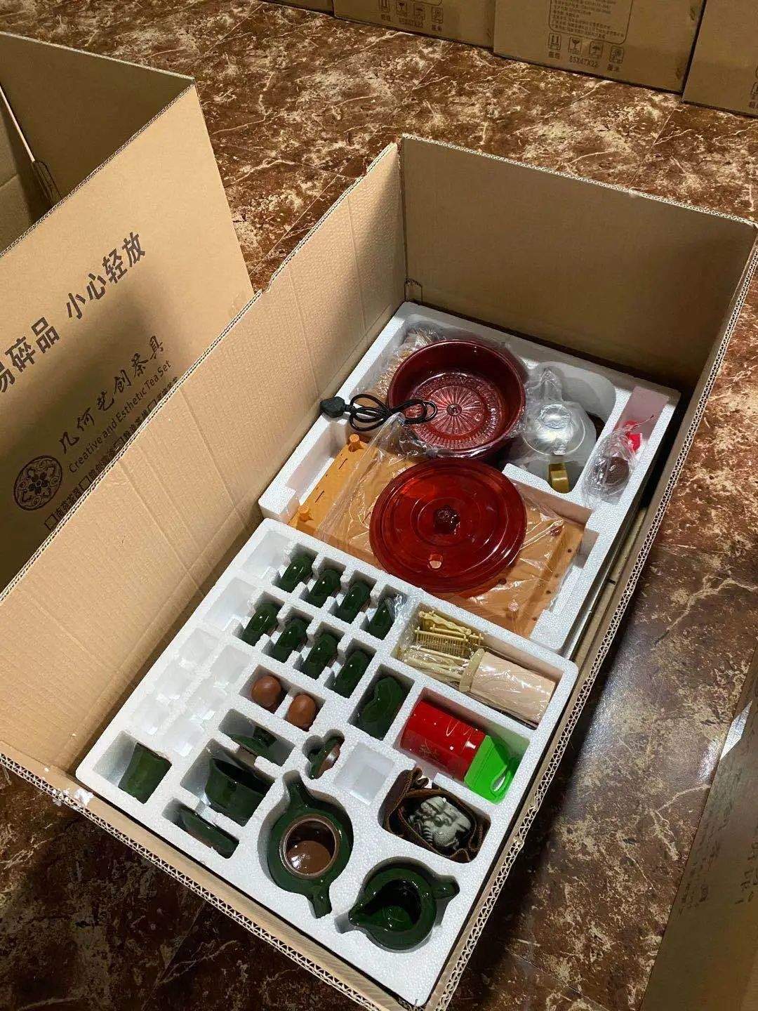 幾何陶瓷員工正在將整套茶具內(nèi)部產(chǎn)品排列規(guī)范整齊
